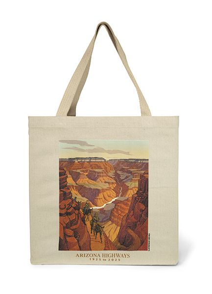 In celebration of Arizona Highways’ centennial, we produced this limited-edition, premium 12 oz. cotton canvas tote bag. The vintage illustration printed on this bag was created by Chris Gall for the January 2017 cover of Arizona Highways. 14 ¼" square with 4 ½" bottom gusset. Extra-long 24" cotton webbed handles are reinforced with stress point stitching. Made in India; printed in the USA. Machine wash cold on delicate cycle. Allow bag to air dry.