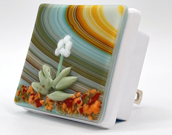 This alluring fused-glass night light is truly one of a kind. The warm glow of light is automatic, as a sensor detects darkness. Stunning when lit. 2" square. Made in Arizona. Handmade items may vary from photos.