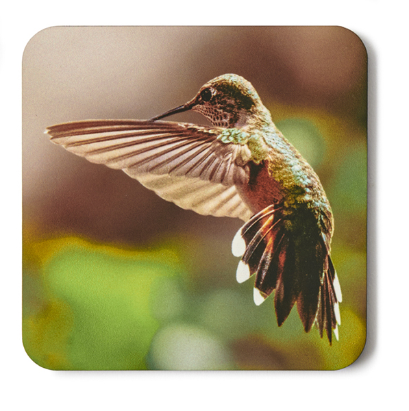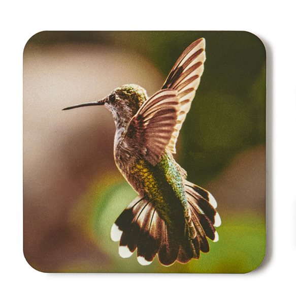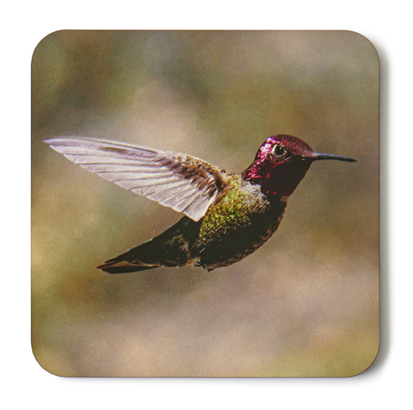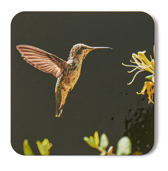 Enjoy four different stunning hummingbird images in this set of four laminated hardboard coasters. The varying colors of each photograph make them perfect for any decor. Cork-backed to protect surfaces and boxed for gift-giving. 3¾" square. Made in the USA.