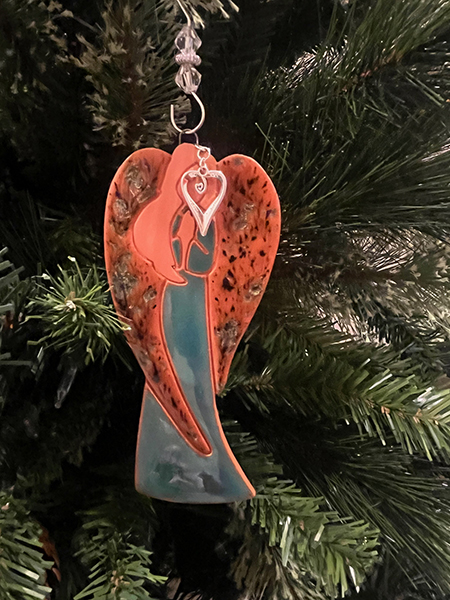 This beautiful angel is hand stamped into red clay, painted and kiln-fired, then adorned with a silver heart charm and beaded hook. 3 x 6" plus hook. Made in Arizona. Handmade items may vary from photos.
