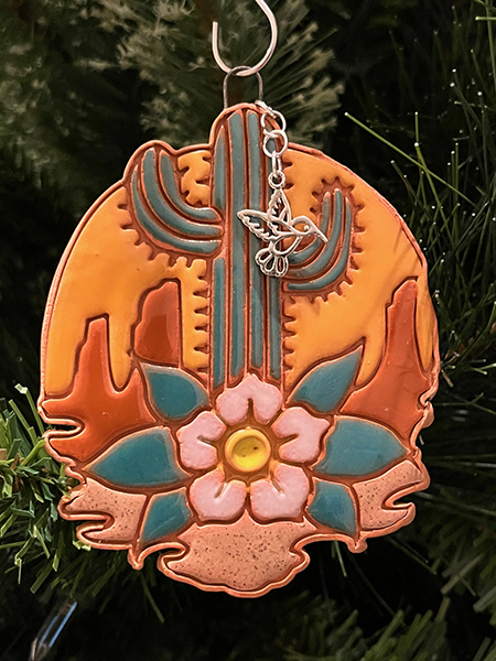 This beautiful desert scene is hand stamped into red clay, painted and kiln-fired, then adorned with a silver hummingbird charm and beaded hook. 3¼ x 3" plus hook. Display year-round. Made in Arizona. Handmade items may vary from photos.